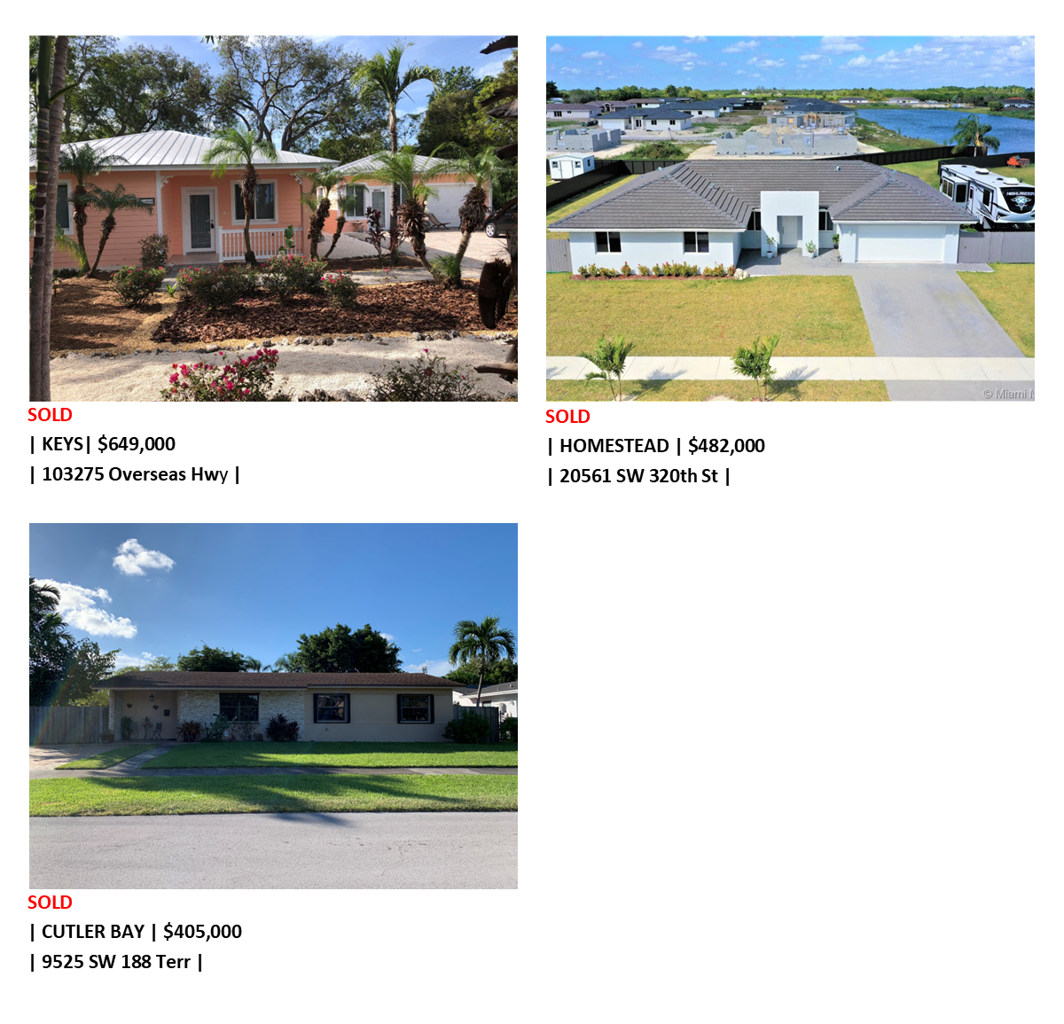 Three suburban homes with lawns and driveways under clear skies.
